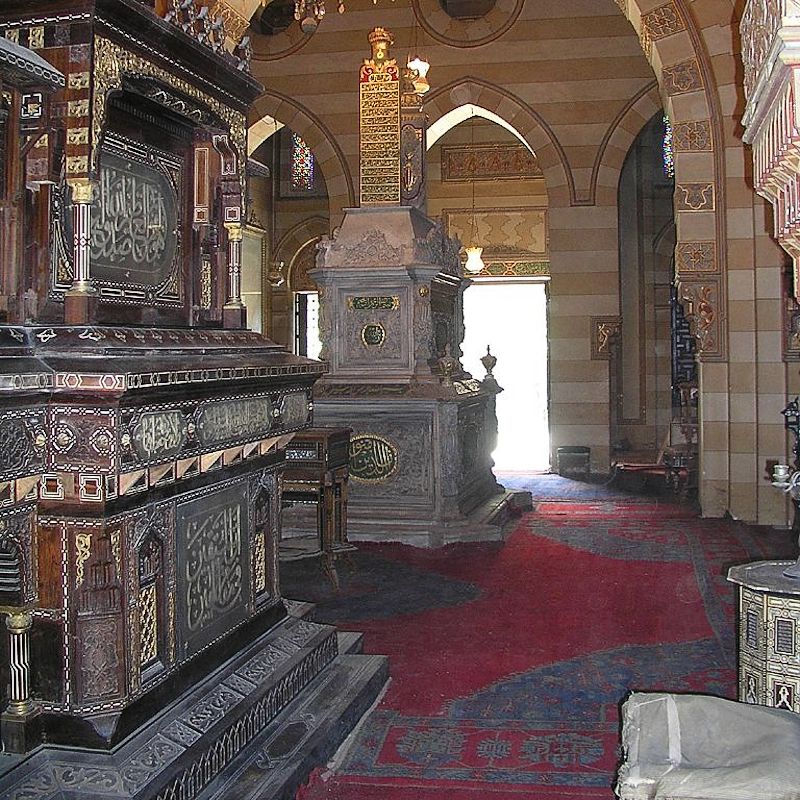 The tomb was originally built as a mausoleum for the mother of Abbas I Pasha and was enlarged in 1881 for Khedive Tawfik and his family. Above the entrance, Mamluk stalactite decoration is found. Inside the door on each wall, parts of the gold woven cover of the holy Kabah in Mecca. The story goes that some tried to replace these with copies some years ago, and that's part of the reason the mausoleum was closed for a longer period.